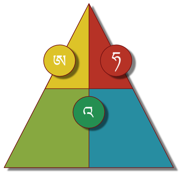 Click on the link to go to the “blue” version of the pair-work exercise; follow the instructions and communicate with “yellow” to complete the task. When you're finished, click the link at the bottom of the page to move on to the next exercise! b.ii) Color-coding Pronunciation "Three Root Vowels" Our color-coded pronunciation guide is based on the traditional 3 root vowels—”A,” “HA,” and “AA.” Understanding the difference in accentuation and aspiration between these basic vowels gives students a foundation for hearing the difference between all the letters of the Tibetan alphabet. The Triangle The four colors of the pronunciation triangle represent the four main sounds of central standard Tibetan by combining the traditional 3 root vowels with features described by modern linguistics: 1) Yellow: unaspirated, high tone; 2) Red: aspirated, high tone; 3) Blue: aspirated, low tone; and 4) Green: unaspirated, low tone. High Tone Yellow and Red colors represent sounds that are “high” and “sharp.” Their symbol is the upward-pointing arrow. While there isn’t a ready corollary in western languages, listen for aspects of yellow and red sounds like: pitch (higher); duration (shorter); and accentuation (sharper). Low Tone Blue and Green colors represent sounds that are “low” and “relaxed.” Their symbol is a downward-pointing arrow. While there isn’t a ready corollary in western languages, listen for aspects of blue and green sounds like: pitch (lower); duration (longer); and accentuation (duller). Unaspirated Yellow and Green colors represent sounds that are “unaspirated;” they are symbolized by a candle with a steady flame. Imagine holding a candle in front of your mouth when you are speaking – the flame does not flicker for unaspirated sounds. That’s because very little air is expelled by the breath when speaking them. In English, for example, you can hear a difference between the “p” sound in “pin” (aspirated – the candle's flame flickers) and “spin” (unaspirated – the candle's flame is steady). While English and many Western languages don’t consider these different sounds to be different letters, many Asian languages do! In Tibetan (unlike English), an unaspirated sound can also begin a word. Practice by holding a hand in front of your mouth: First say “pin” and then say “spin.” Can you feel the difference from the breath on your hand? Say “spin” again. Can you isolate the “p” sound of “spin”? The “k” sound of “skin”? ... Aspirated Red and Blue colors represent “aspirated” sounds. Their symbol is the flickering candle; this represents the breath that’s expelled when pronouncing these sounds. These sounds will generally feel more familiar to speakers of Western languages (where p, t and k, for example, are aspirated whenever they start a word in English). b.iii) Verb Icons Verbs in Tibetan follow a system based on 'evidentiality'. Most second language learners are used to strict grammars where the verbs used are fixed based on the relationship between items within the information itself. In contrast, Tibetan verbs are flexible and depend upon the the relationship between the speaker and the information. We've left icon clues to help second language learners see the difference between how different verb forms are used in Tibetan. These are based on two spectrums (note that these are not strict category systems—keep in mind that overlaps and ambiguities are natural, as verbs in Tibetan are context and speaker-dependent constructions!): b.iii.1) Spectrum of Space 'Near' verbs are personal in nature; they have a subjective quality about them, and communicate the speaker's 'nearness' to the information or event, or subjective control of an action. We've adopted the 'you are here' pin-drop with a bold person to indicate the 'personal' or 'near'. 'Perceived' verbs are a special sub-category of the 'personal' or 'near'; they mark information that the speaker has subjective experience of (things the speaker is direcly experiencing happen through one of the five senses). We add an eye to our pin-drop to show the direct, perceptual nature of these verbs. 'Far' or 'impersonal' verbs are general facts, common knowledge, or other information received from a third party. The icon for the 'impersonal' is the shared network icon. This information is available across one's social network (it is not unique to the 'personal' perspective), or it's related to someone else's experience (meaning the speaker only has access of it indirectly, through or because of the network). b.iii.1) Spectrum of Time 'Immediate' events or actions occur, or are occuring, in the speaker's immediate vicinity (in time and space). They are local, direct, singular or unique, and current or very recent (within the contextual frame of reference). A drop of water initiating ripples indicates the 'immediate'. 'Continuous' events and actions are ones that re-occur over and over again. They are a stable, yet also changeable and/or circumstantial, set of actions or facts that define the speaker's reality. The ripples spreading out across the globe indicate 'continuous'-type verbs. 'Permanent' events or actions are fixed facts (as far as the speaker is concerned). They are a super-continuous state of affairs, or general or common knowledge. A solid globe indicates these fixed facts of the matter for 'permanent' verbs. ![]() 2) Basic RulesThere are a few basic rules to follow if you want to get the most out of this book and the way it was designed. We have consolidated these into 3 modern, research-based principles for learning language: 1) 100% Tibetan; 2) 100% speaking; and 3) 100% positivity. Let us explain the reasoning behind these for you briefly: a) 100% Tibetan